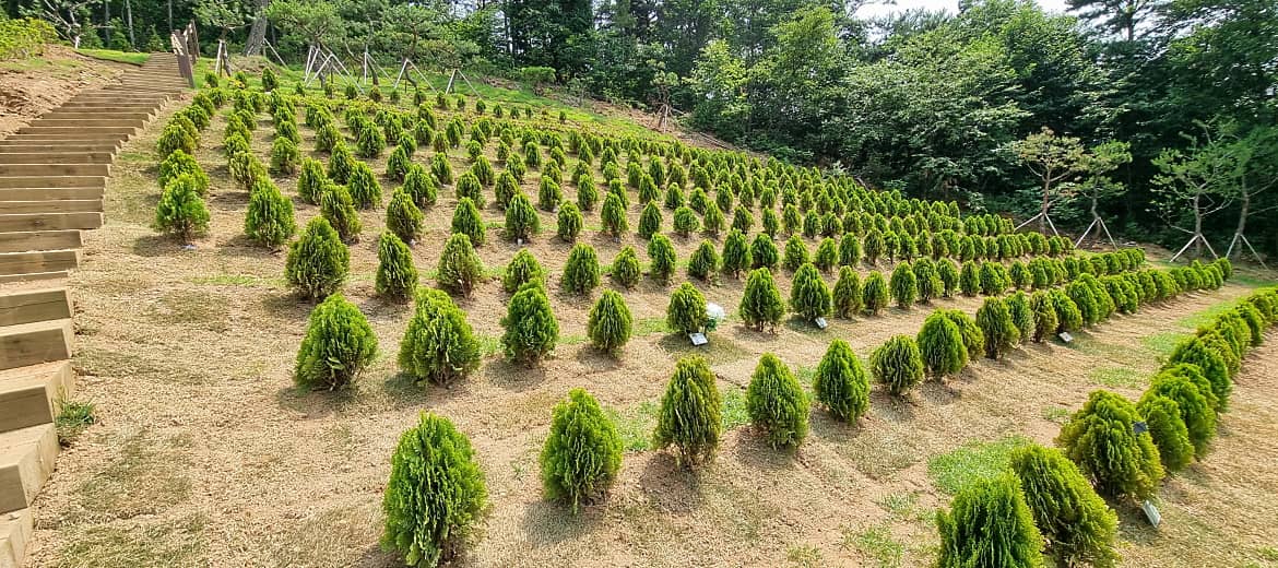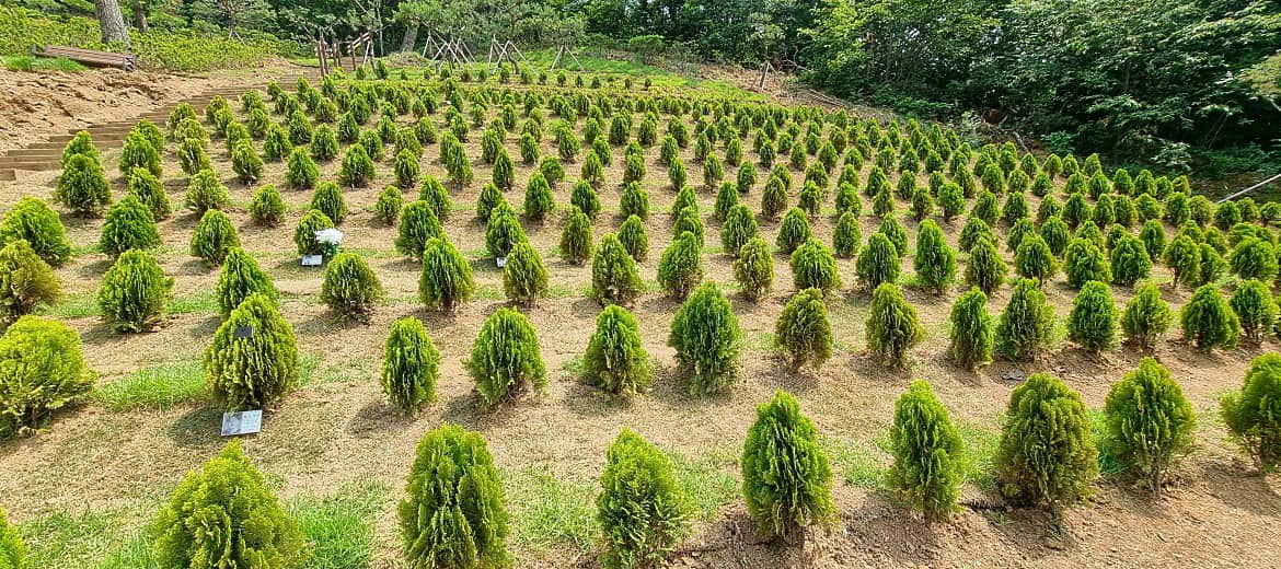 황금측백나무는 키작은 나무로 조경수나 산소주변 둘레목으로 널리 사랑받는 수종이다.